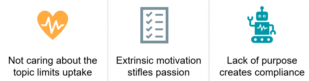 If we focus on coverage, we lose the sense of purpose. The material becomes disconnected to something that matter, to things that we care about. Nobody learns what they do not care about and it is detrimental to student learning. We sometimes force the care through assessment, rewarding success with numbers but this creates compliance: