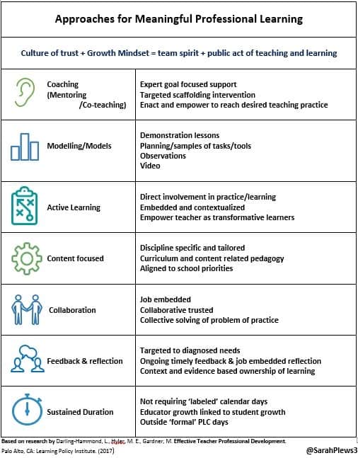 The summary research paper on Effective Teacher Professional Development (Learning Policy Institute, 2017), which I’ve outlined in brief in the table below, highlights effective professional learning approaches that support and give ownership for meaningful teacher professional learning.
