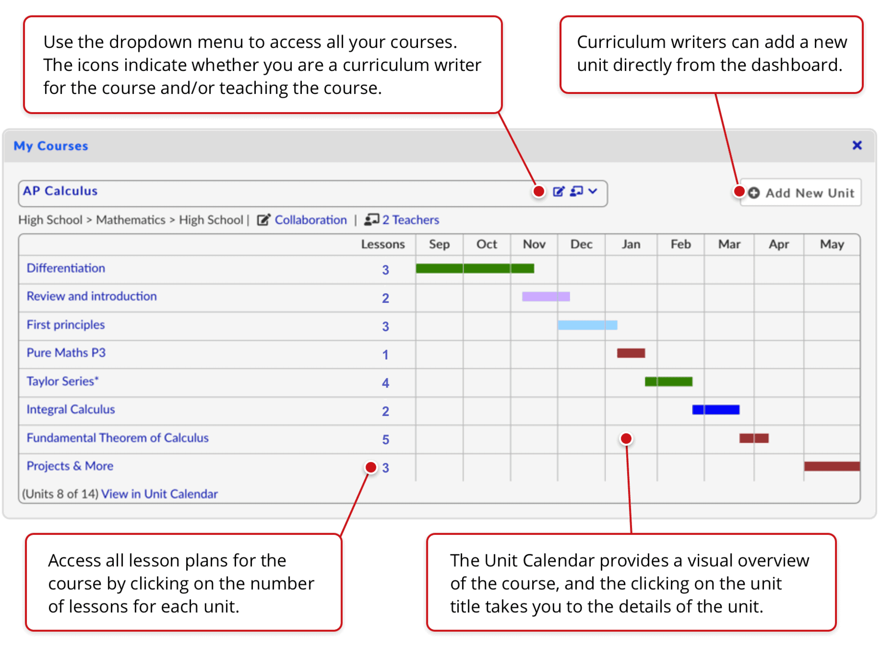 - Viewing all lesson plans for any units and the creation of new lesson plans (if their school uses the Atlas “Lesson Plan” feature).