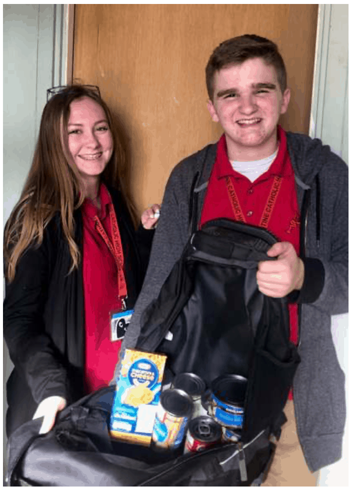 Student Council members offered to lend a hand, make posters, spread the word on social media, and promote another food drive where students earned a free dress day for donating two cans of food. With the help of additional students and faculty from the culinary class and Wolves for Life club who organize the pantry, this year’s backpack program will certainly meet its goals. Parents who transport the backpacks to the schools and parishes also serve a vital role. Volunteer and Marine Corps combat veteran Scott Taras said, “When I learned we would be donating food to the less fortunate in my very own community, I just had to get involved. I want to help my country and community.... I’m the last stage of the mission.”