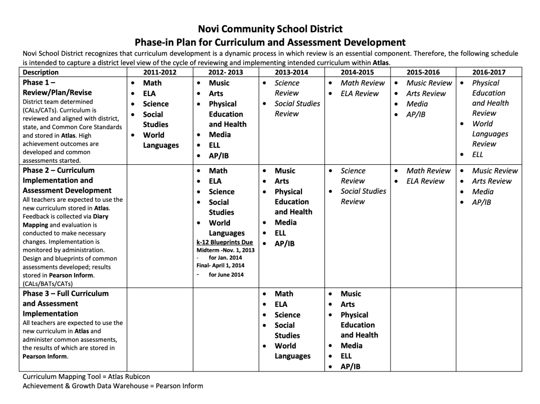 In addition to outlining who would do the work, the team at Novi created a plan to prioritize what content areas would be developed and when. As you can see in their plan, they have a 3-phase process: Review/Plan/Revise, Curriculum Implementation & Assessment Development, and Full Curriculum & Assessment Implementation. Groups of content areas entered each phase in a different year so that they would have the time and budget to support the various phases.