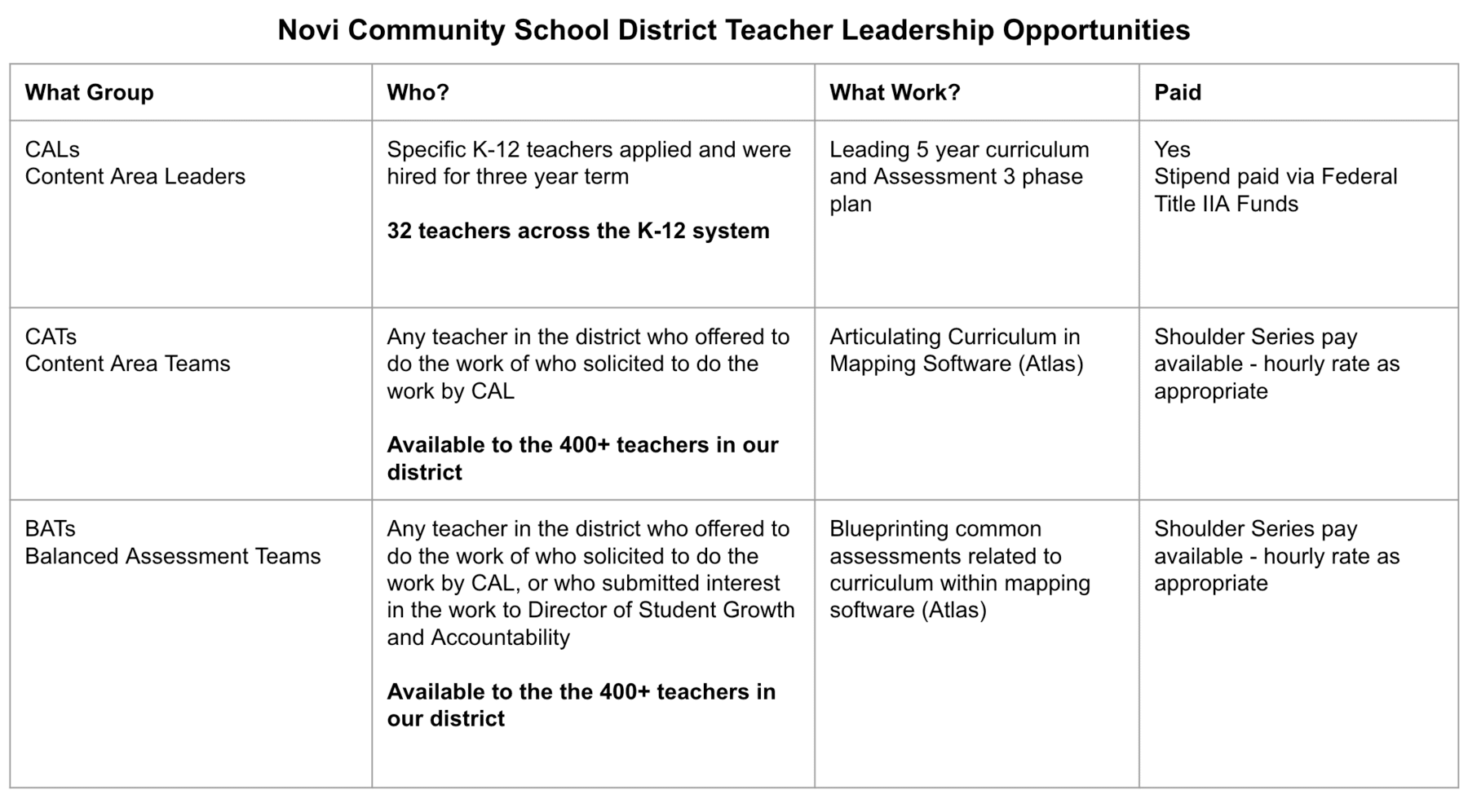 When Novi began this work, they completely restructured their teams. They eliminated the role of department heads and instead created a new position called Content Area Leaders (CALs). Because of this shift, they were able to change the responsibilities of the team and begin a competitive application process to find the best teachers to lead the work. Once they built a team of CALs, they tasked them with recruiting additional teachers to do the writing. As Dr. Webber put it, they left 100% of the fate of their curriculum writing with the teachers. This led to a higher level of teacher engagement and ownership.