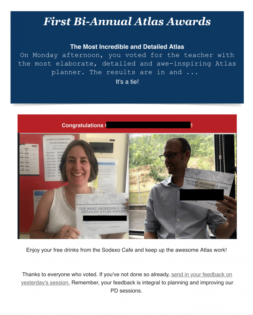 In an effort to make the use of Atlas more authentic and collaborative, we have infused after-school professional development sessions with a sense of fun around Atlas. One simple, but effective, way we did this was to ask teachers to vote for another teacher in a “Best Atlas Ever” award.