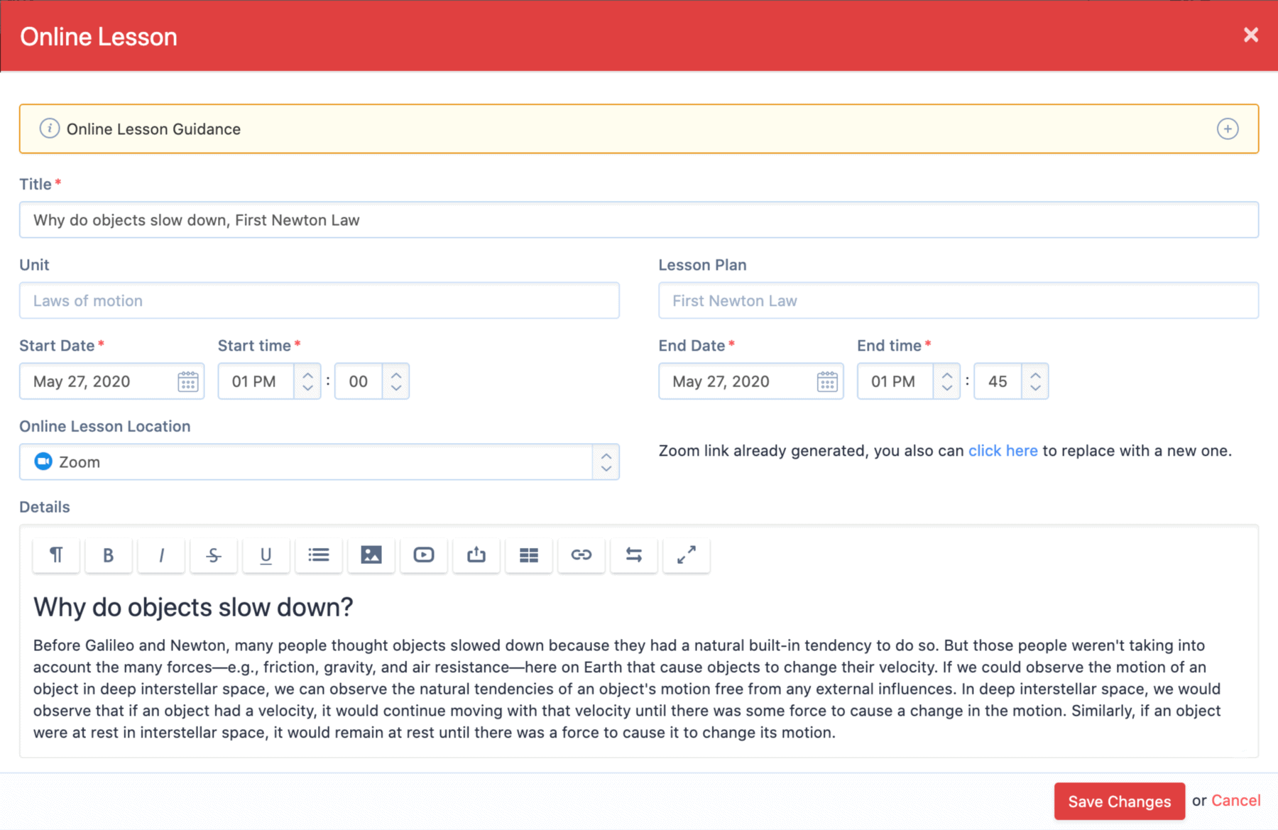 To add an Online Lesson, teachers will provide a start and end time of the lesson, and a brief description to provide students with the background and expectations of the lesson. Teachers are free to choose whatever platform they are most comfortable with to conduct the online lesson. They simply copy and paste the URL of the Online Lesson meeting location. If Zoom is used, the URL will be automatically generated.
