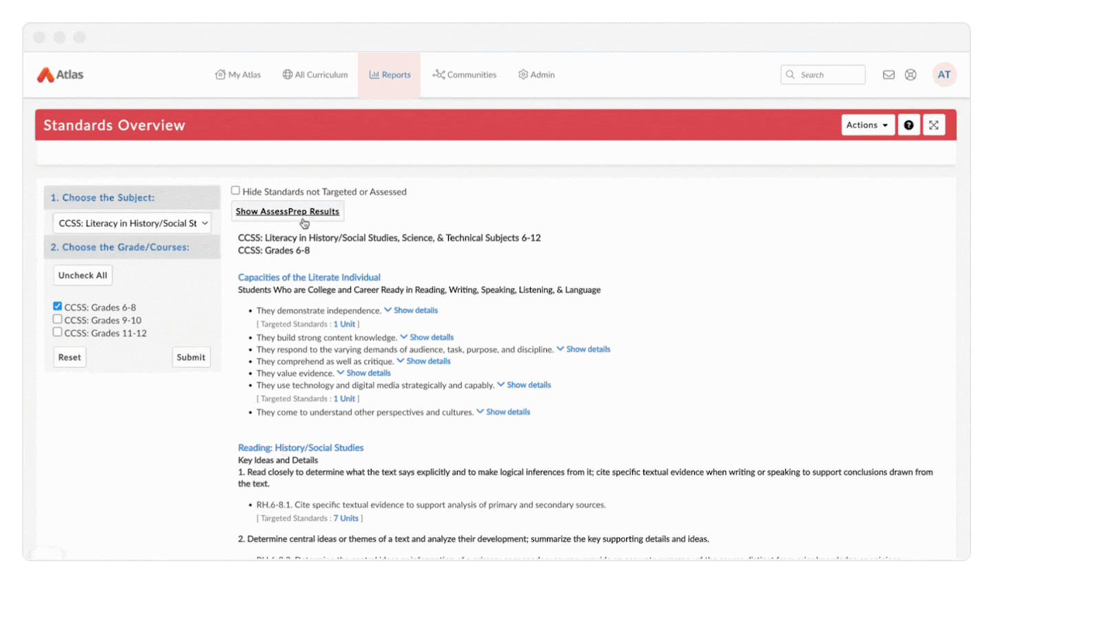 With the AssessPrep integration, educators can now use Atlas to see how standards are both taught and assessed within their curriculum, alongside real-time assessment data from AssessPrep. By utilizing the Standards Overview report in Atlas, teachers can analyze: