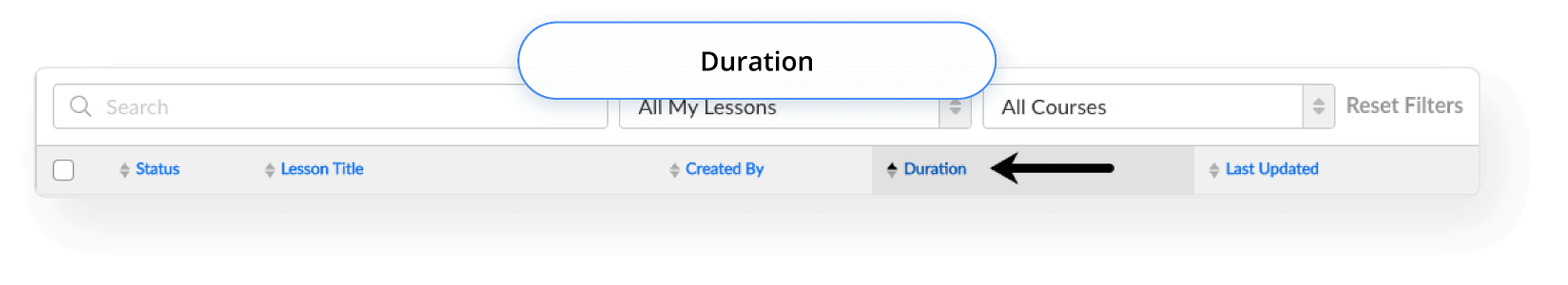- Click on the heading Duration to sort by date. This will allow you to find any lessons that are missing dates. This is especially useful if you like looking at the calendar views, but notice that lessons are missing. Simply click on the lesson name to edit the lesson and add duration.