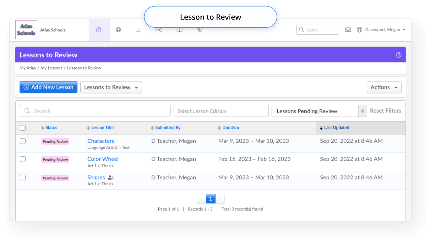 If you are responsible for reviewing lessons, this new page is for you! Utilize this page to quickly see what lessons have been submitted for review. You can click the lesson name to review and/or add comments. You can mark the lesson as reviewed directly from the lesson page or from this Lessons to Review page.