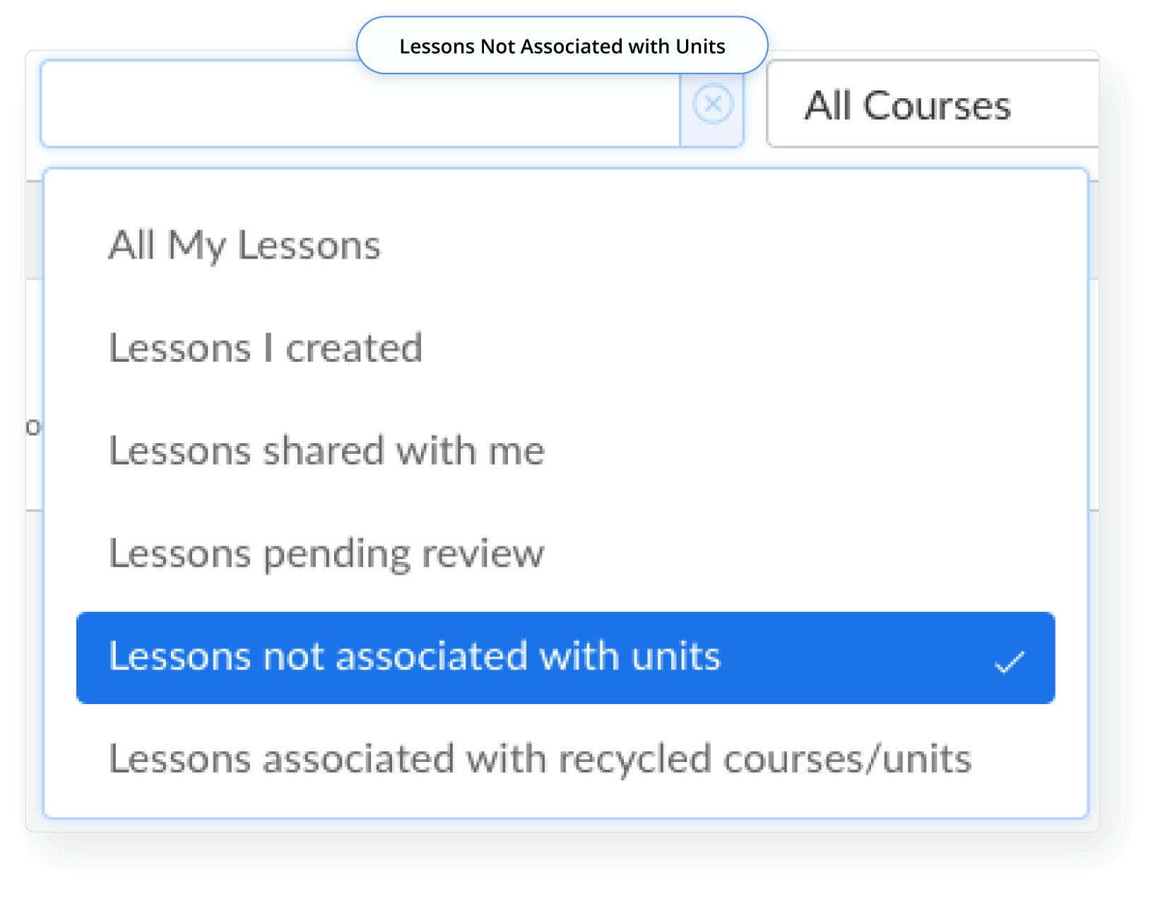 - Use the middle filters to find Lessons not associated with units or Lessons associated with recycled courses/units. Once you have identified these lessons, you can determine if they should be assigned to units/courses or deleted.