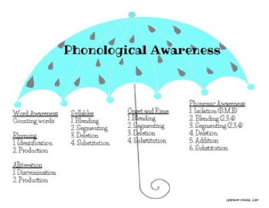 Imagine phonological awareness like an umbrella and under that umbrella there are several other skills, with phonemic awareness being one of them. Orton Gillingham organized and named these different pieces as: