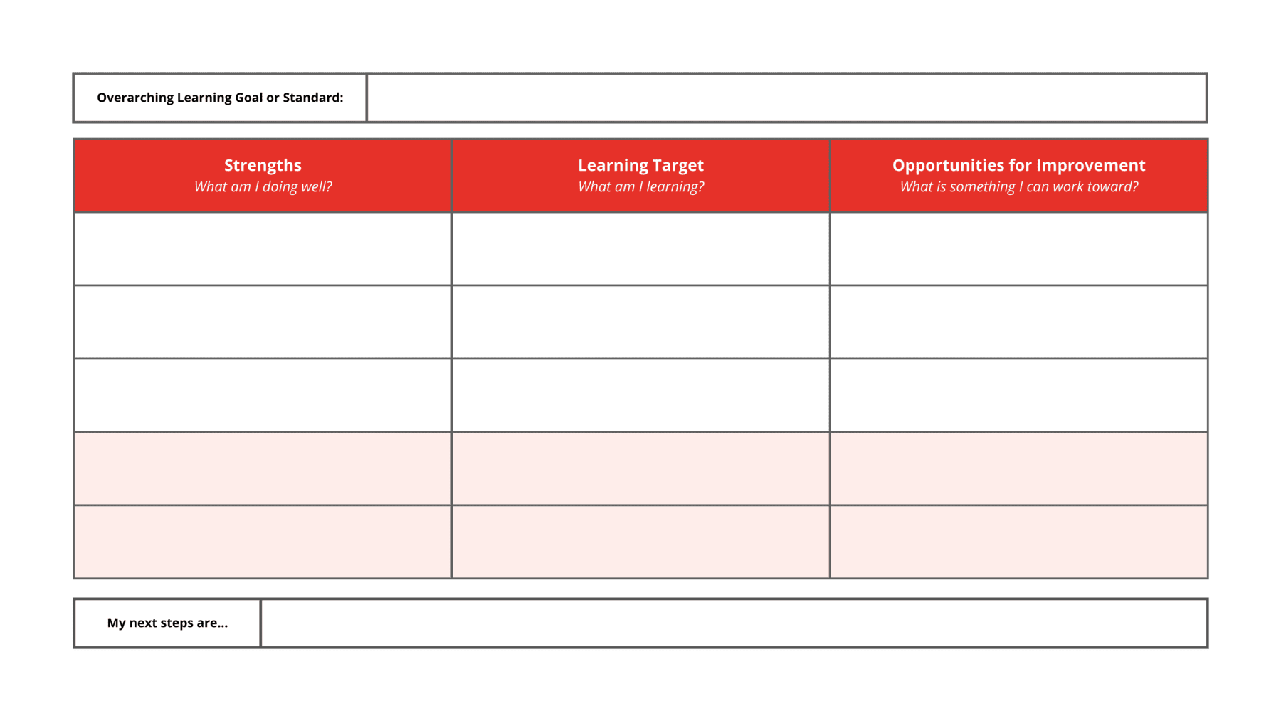Single-point rubrics often break down the learning targets and success criteria into smaller pieces, or more concrete tasks, so that students can clearly identify their strengths and areas for improvement.