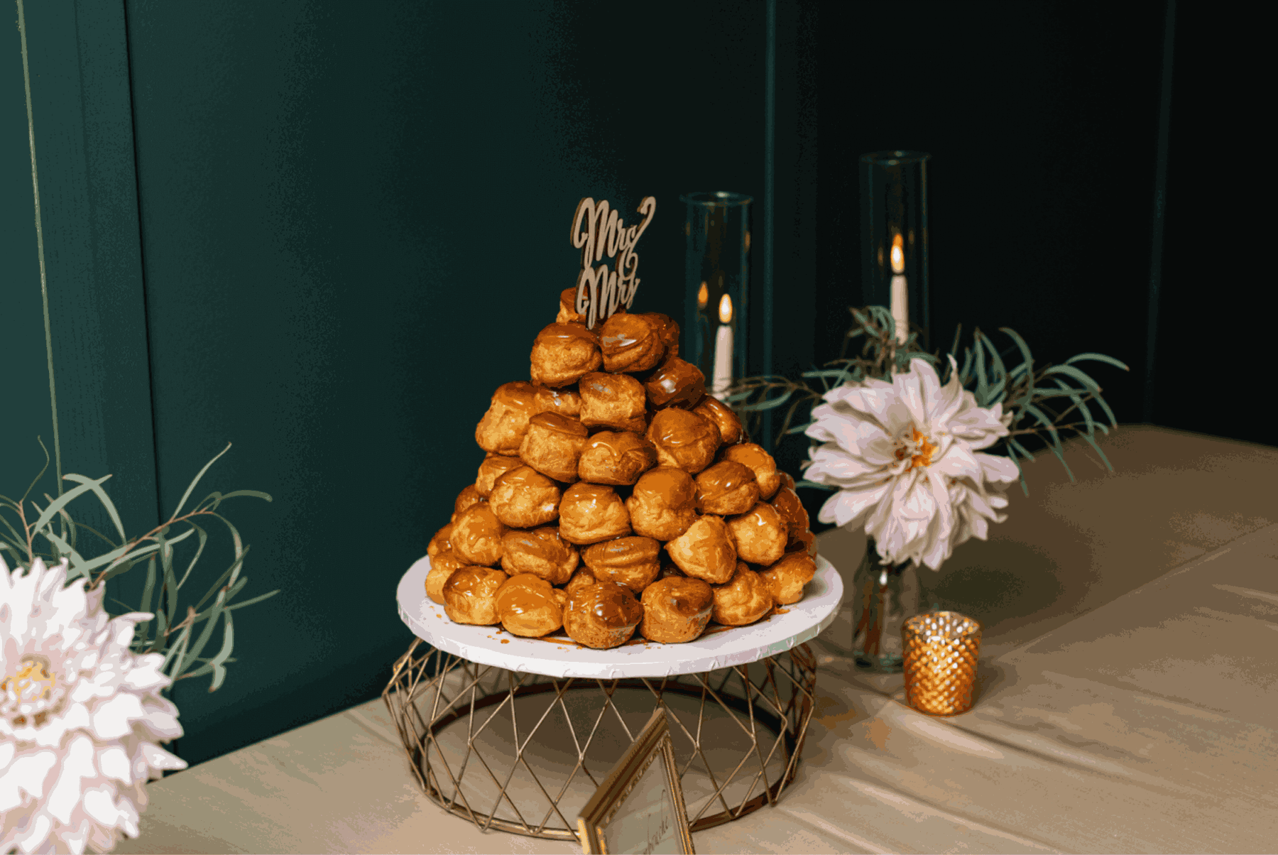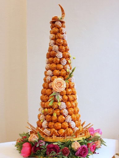 Everything went exactly as planned. The weekend was magical, the ceremony was beautiful, blah blah blah….Even the food was delicious–I made extra sure of that! The one thing I was surprised by was our wedding cake. I’ll be honest–I don’t like cake. I especially hate fondant. So my husband and I had worked with a local baker who agreed to make us a croquembouche instead. A croquembouche is a traditional French wedding pastry made of dozens of cream puffs assembled into a tower and decorated with a cloud of golden sugar thread. Highly technical, very stuffy, and incredibly beautiful.