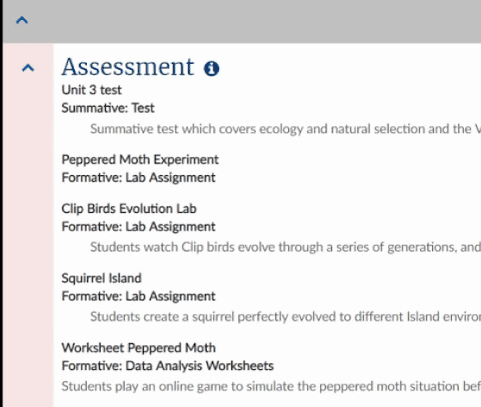 Here is where all the lesson planning came into play. I thought about what labs, lessons, and activities would be used to deliver content. I realized that NGSS is written so that teaching is really about guiding students; we already know what the student needs to be able to do to show that they have mastered the standard. Build the content around those. I considered Atlas as my personal online library to upload all of my content, files, resources, slides, review sheets, outlines of labs, everything. This collection is everything I have ever created or found to be useful to teach the content. Even as I curated my materials, I knew I would leave it there, as an archive for whoever would teach it next; my version of “pay it forward.”