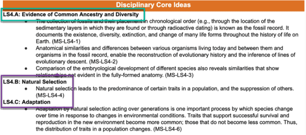 Disciplinary Core Idea (DCI): These are the key ideas that the students need to understand and take with them for further learning in upper level science.