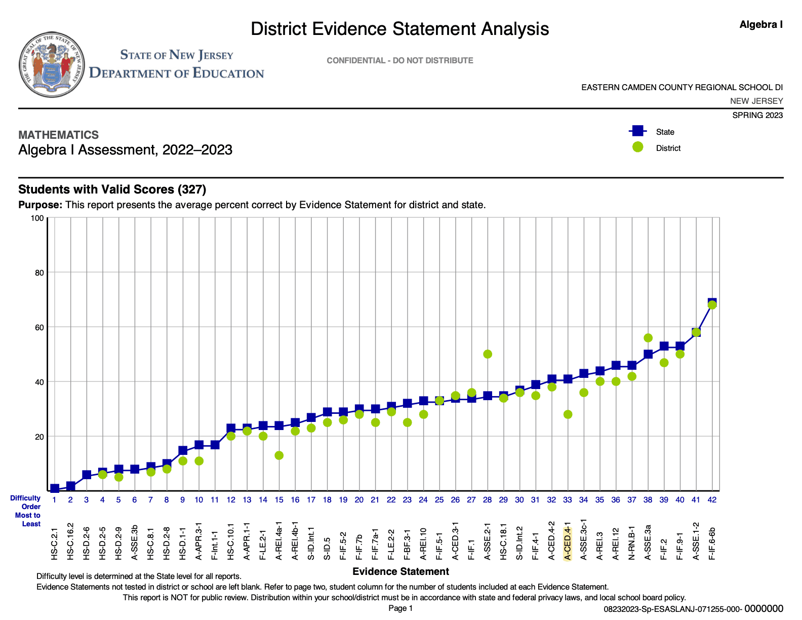 To illustrate our process, we’ll focus on student achievement in Algebra 1. Eastern’s 2022-2023 NJSLA District Evidence Statement Analysis is shown in Figure 1.