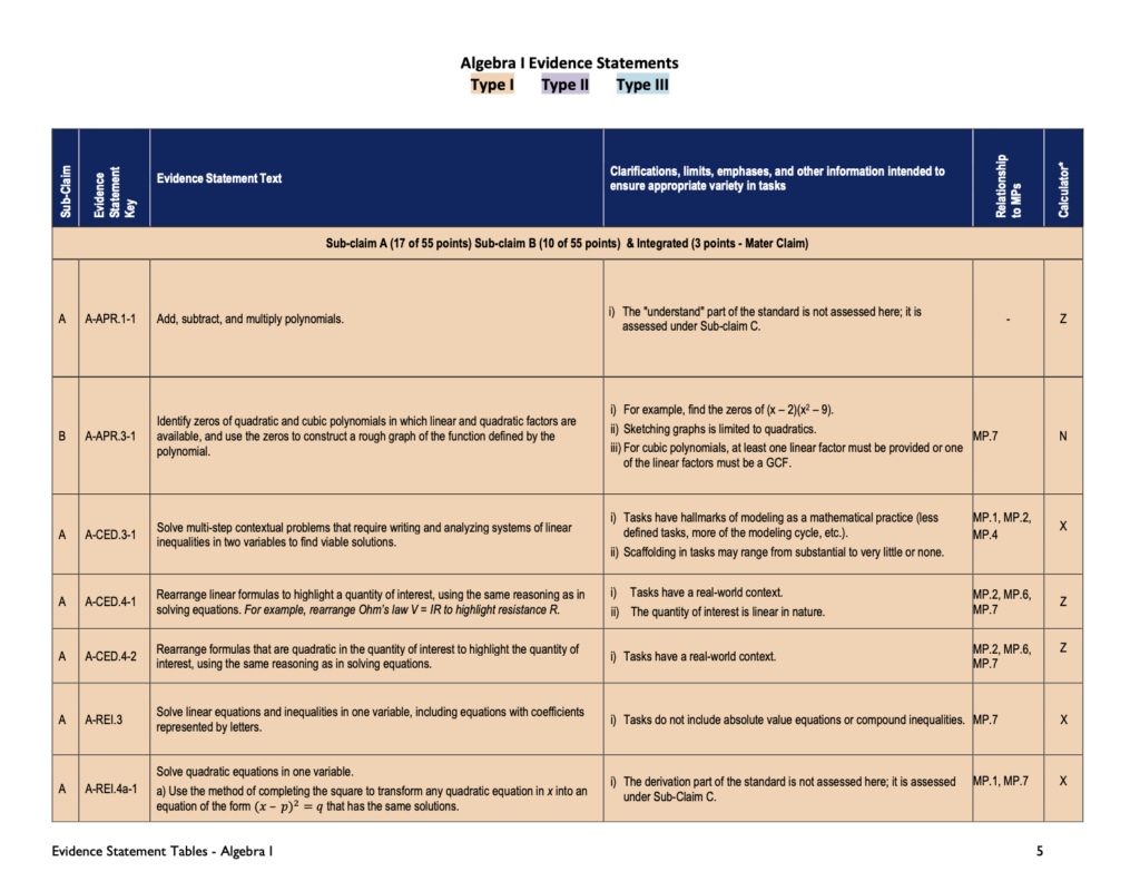 For the purposes of this exercise, let’s focus on Evidence Statement A-CED.4-1. Within the Evidence Statement Analysis document there is a link to the New Jersey Assessments Resource Center. On this site you can navigate to Evidence Statement Tables for any of the NJ state assessments (Figure 2). Searching the Algebra 1 Evidence Statement Tables, we find the A-CED.4.1 Evidence Statement: “Rearrange linear formulas to highlight a quantity of interest, using the same reasoning as in solving equations. For example, rearrange Ohm’s law V = IR to highlight resistance R.”
