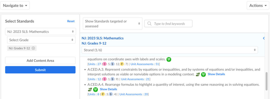 By navigating to the Standards Overview report and searching for the standard in question (A-CED.4.1), we can see (Figure 3) that this standard is linked as a Focus Standard in 8 units and is linked in 20 Unit Assessments. As an aside, at Eastern we classify standards as Focus (F), Supportive (S), or Interdisciplinary (I). Notice the standard has no “Interdisciplinary” connections, which would be expected since this is clearly a standard that directly relates to content taught in our chemistry and physics courses.