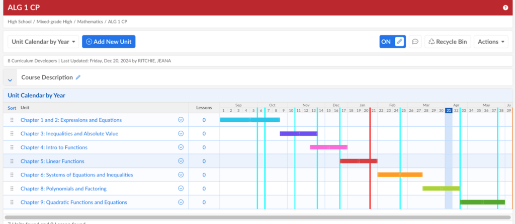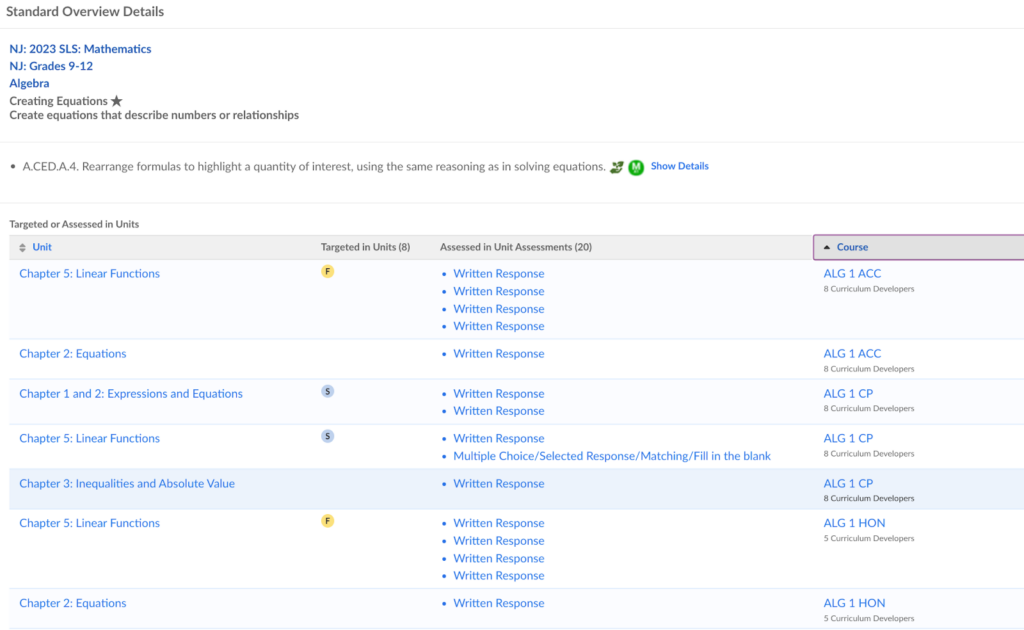 This detail showed me that in our Alg 1 CP curriculum, the A-CED.4.1 standard is only being targeted as a Supporting standard. One more click to the Alg 1 CP course takes me to the Course Calendar (Figure 5) view so I can see what time of year the standard is taught. From this calendar view, I see that the three units in this course that target the standard all appear in the first semester. This is important, as students sit for the NJSLA at the end of May.