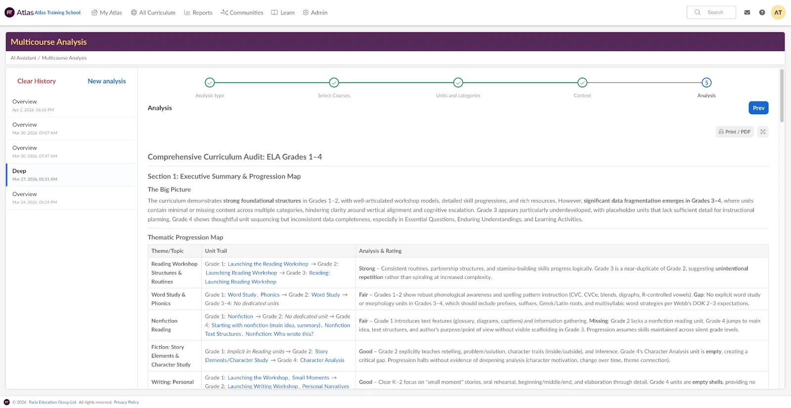 With Atlas Multicourse Analysis, curriculum leaders and teachers can quickly analyze multiple courses and grade levels simultaneously. Access comprehensive AI-powered reports for a subject or departmental review, or an interdisciplinary review to gain actionable recommendations, turning weeks of manual review into insights you can act on immediately.